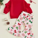 Toddler Girl Christmas Outfits Long Sleeve Round Neck Pullover + Elastic Waist Bow Tree Print Flare Pants 2 Pcs Set