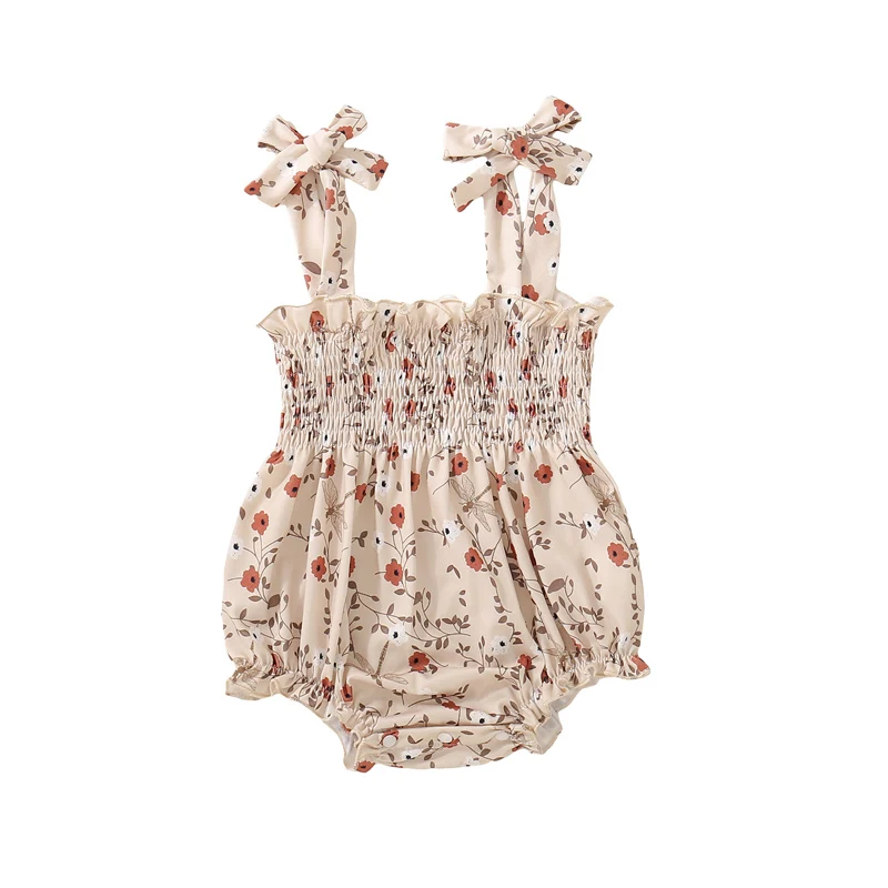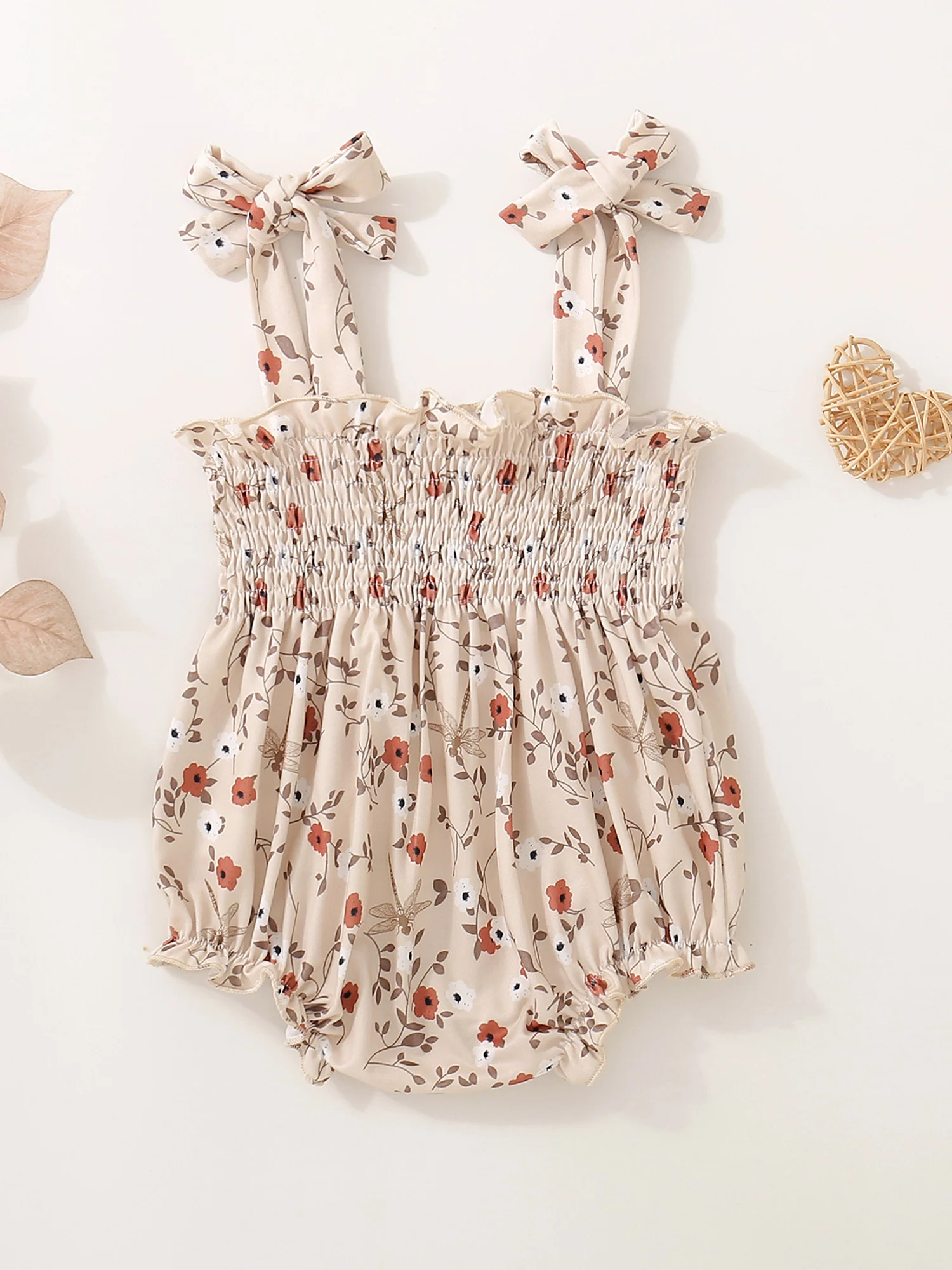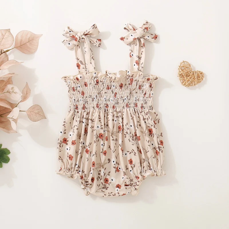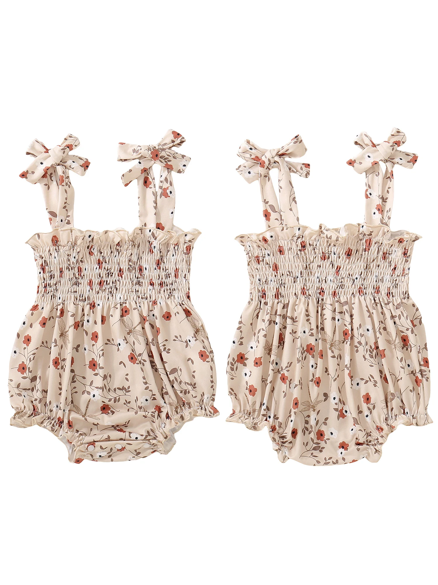 Baby Girl Summer Romper Sleeveless Tie Strap Floral Print Smocked Bodysuit Newborn Playsuit