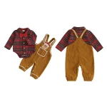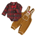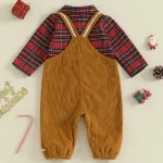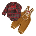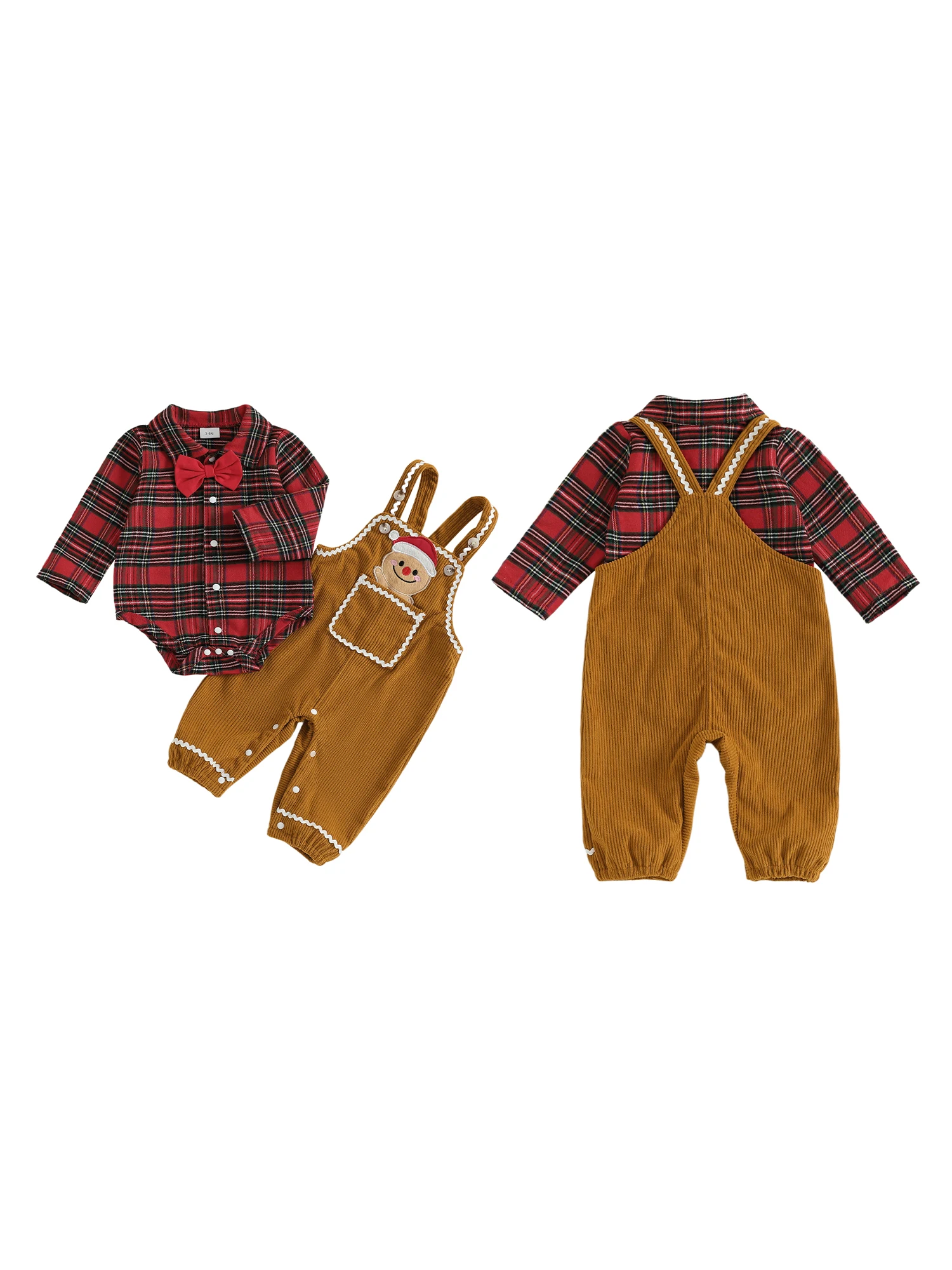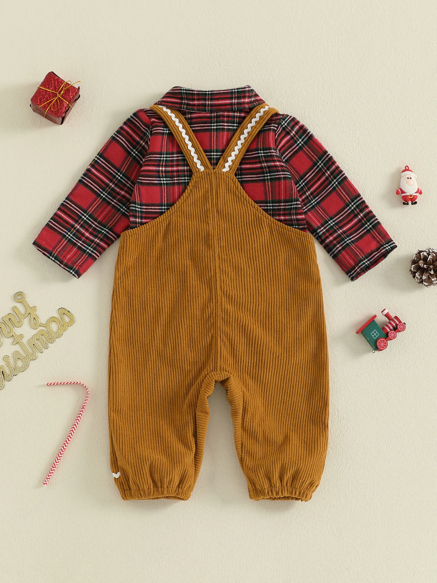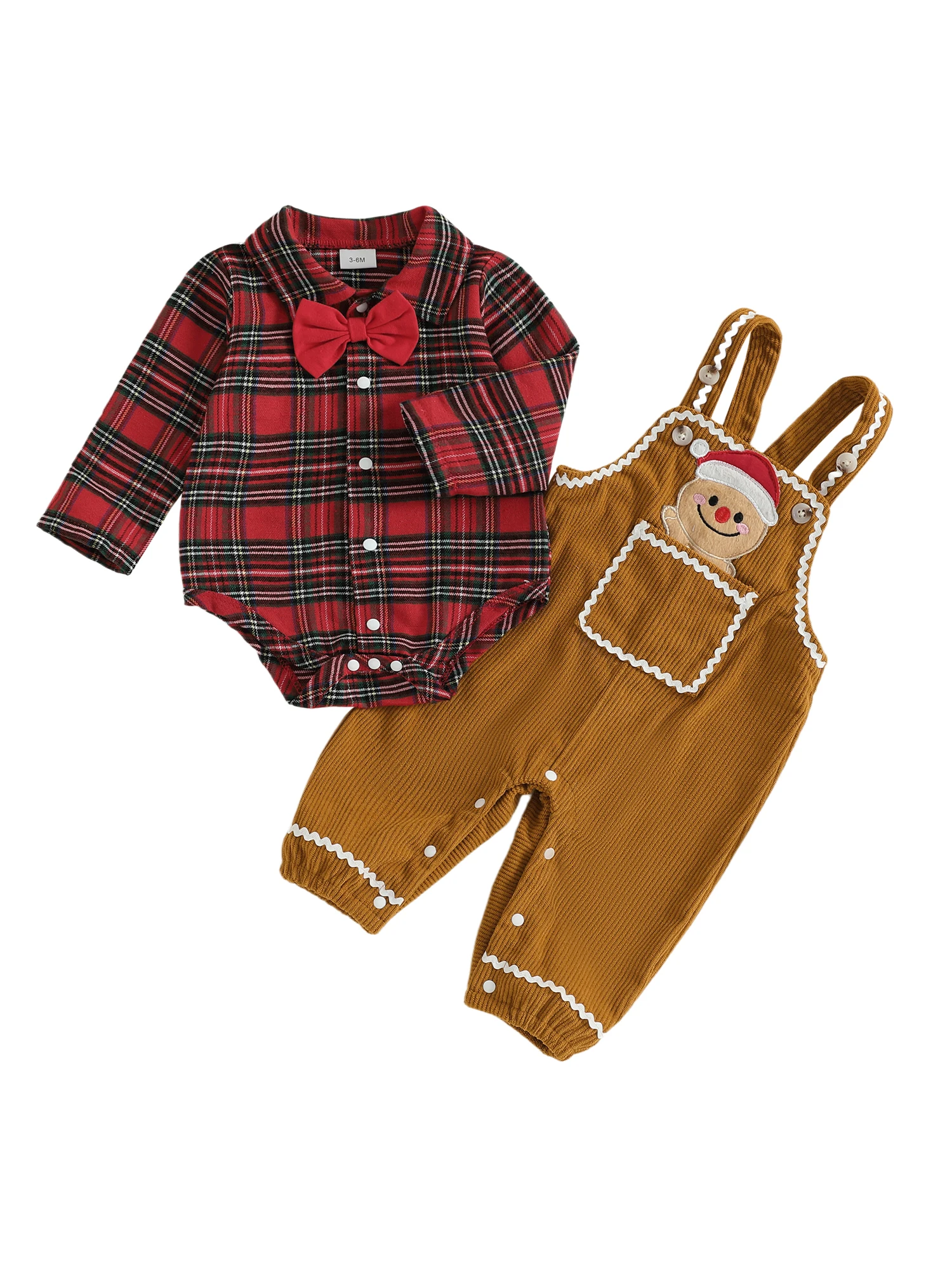 Baby Boy Christmas Clothes Plaid Print Long Sleeve Lapel Romper Gingerbread Man Embroidery Overall Pants 2Pcs Outfit